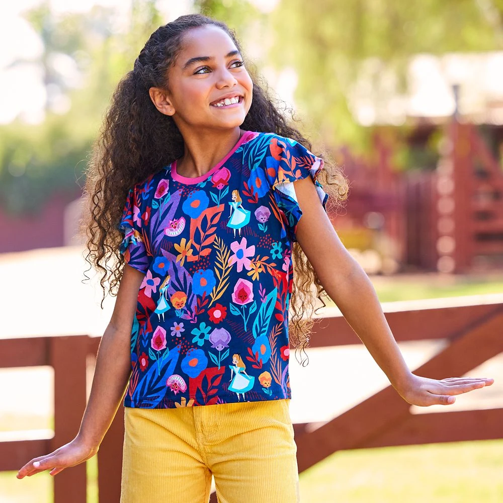 Where is the land beyond the eye that people cannot see? Where can it be? In Wonderland, of course, home of this wondrous fashion tee. Alice, the Cheshire Cat and the garden of live flowers are colorfully stylized allover this surreal top with scalloped edge sleeves and contrast neckline.