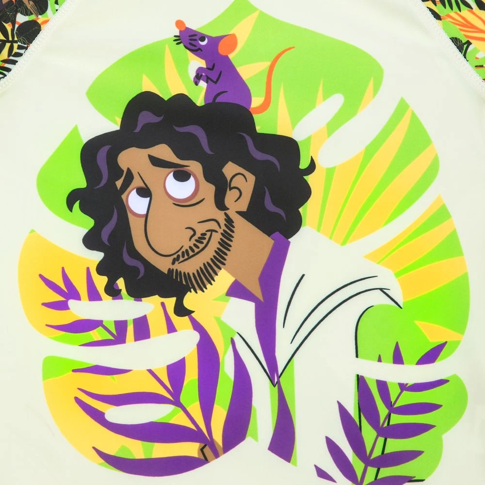The mysterious Madrigal uncle comes out of the dark and into the sun with this adorable Bruno rash guard. He poses with a little furry friend on the front, while the long raglan sleeves feature an allover print of Bruno and his pals surrounded by lush tropical flora. So comfy, colorful and fun, it offers UPF 50+ built-in UV protection. Need we talk about anything else?