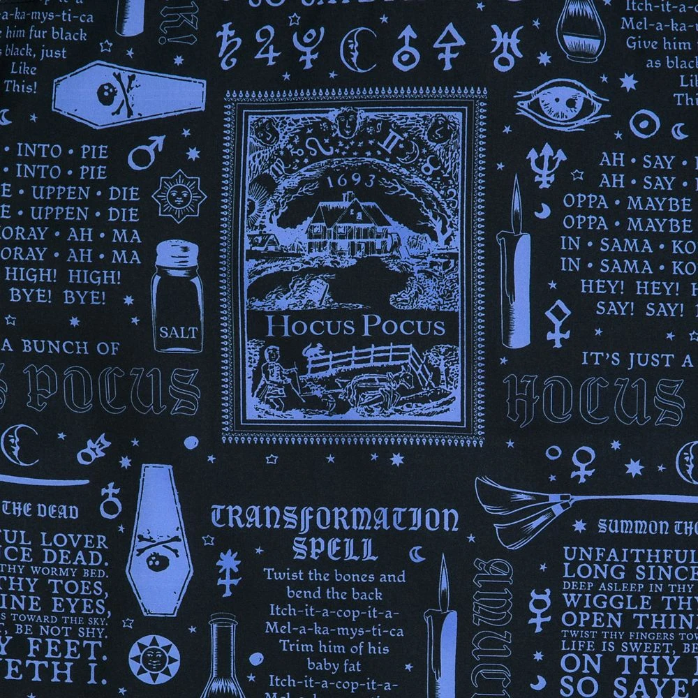 Cast your fiercest spell in this Hocus Pocus ”BOOOOOK” woven shirt by RSVLTS featuring quotations from Winifred’s beloved spellbook and famous icons from the classic Disney film. Softer and more comfortable than any witch would allow, this button down shirt is made from stretchy KUNUFLEX. ”BOOOOOK” defines cool comfort and when it comes to fabulously spooky style, Wini called it.Â