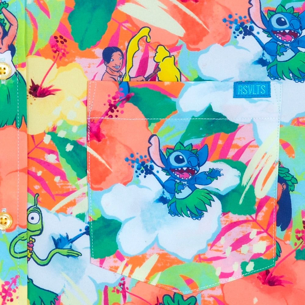 You’re at the center of the party every time you wear the ”Let’s Dance” button down shirt by RSVLTS. The colorful Hawaiian pattern features Stitch, Lilo, Nani, David, and Mertle dancing the hula—even Jumba Jookiba and Pleakely can’t resist the aloha spirit. Made from KUNUFLEX, the woven shirt’s four-way stretch and cool comfort are definitely cause for celebration.